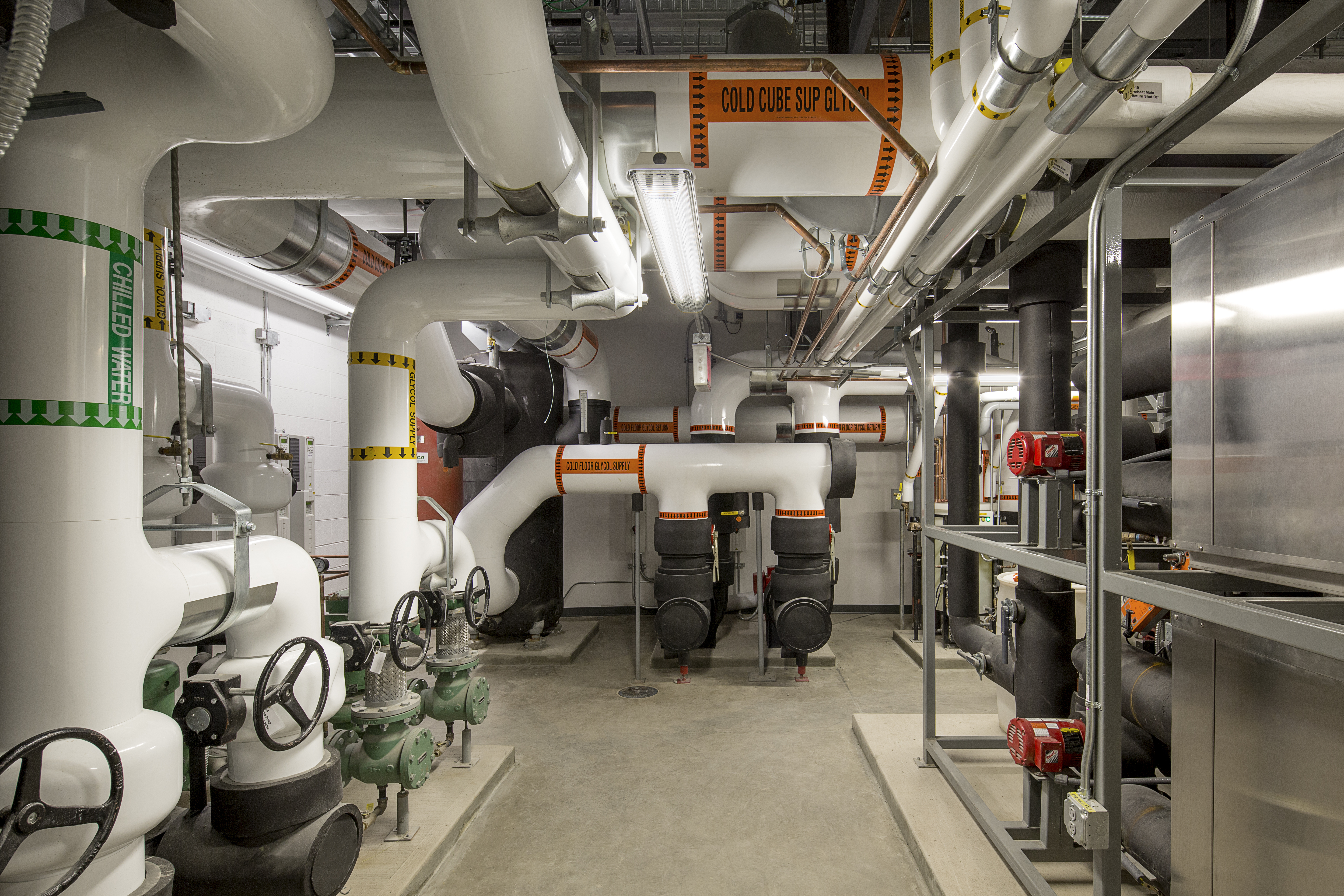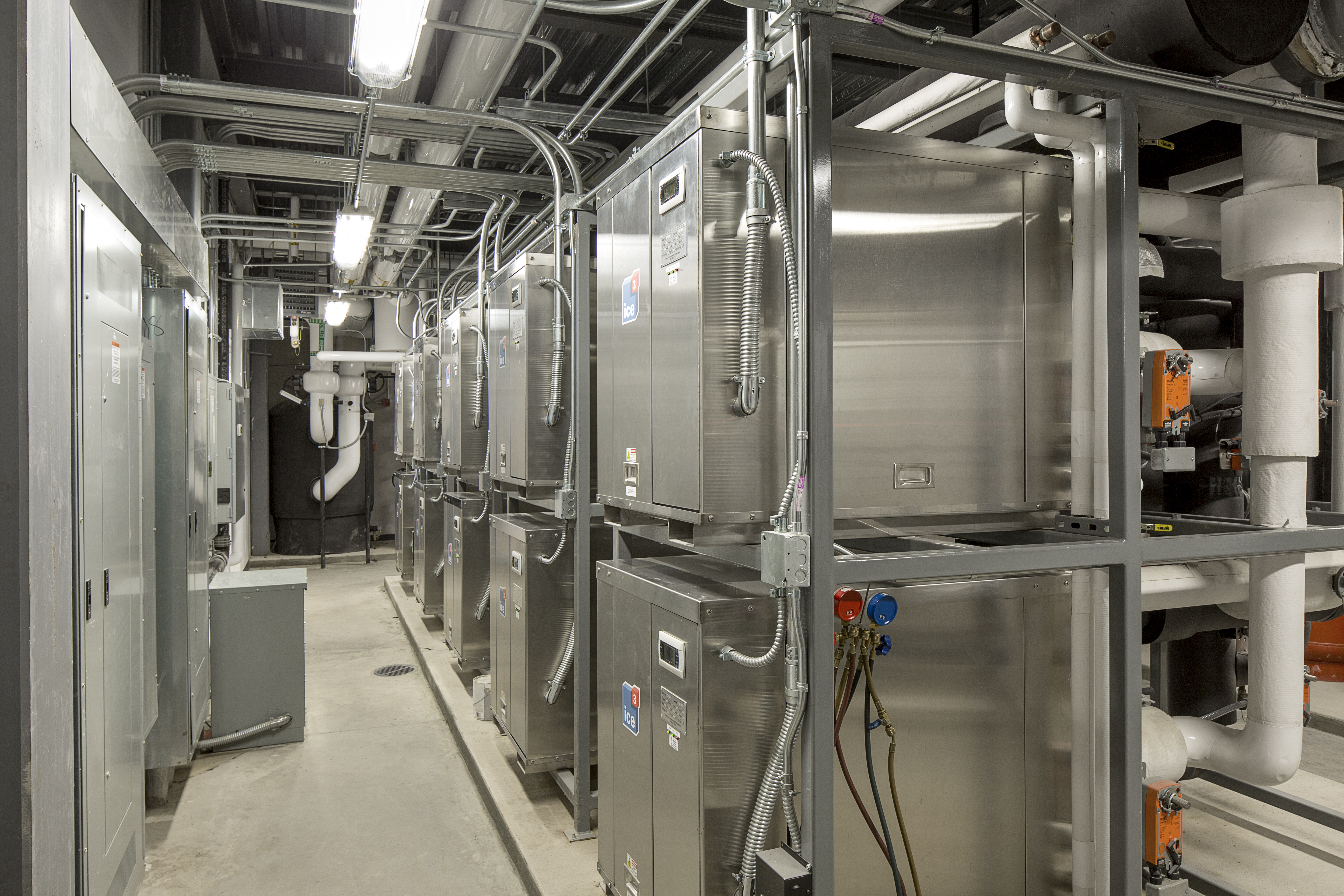 With use of Emerald’s Environmental Technologies Direct Digital Control package, load shedding could be performed in the event that additional priority refrigeration was needed. The system employed reclaimed heat during Cube operation for use in snowmelt, warming the locker room floor, and reheating all other spaces including the rink itself. A backup boiler system was installed to maintain a 105-degree Fahrenheit heating loop in periods of low Cube operation for high heat requirements. An evaporative fluid cooler was also installed to reject all heat not required by the building. The evaporative cooler was remotely mounted at the rear of the building’s third level, and concealed with screening, so from an architectural point of view, the building had no ground-mounted or exposed equipment.