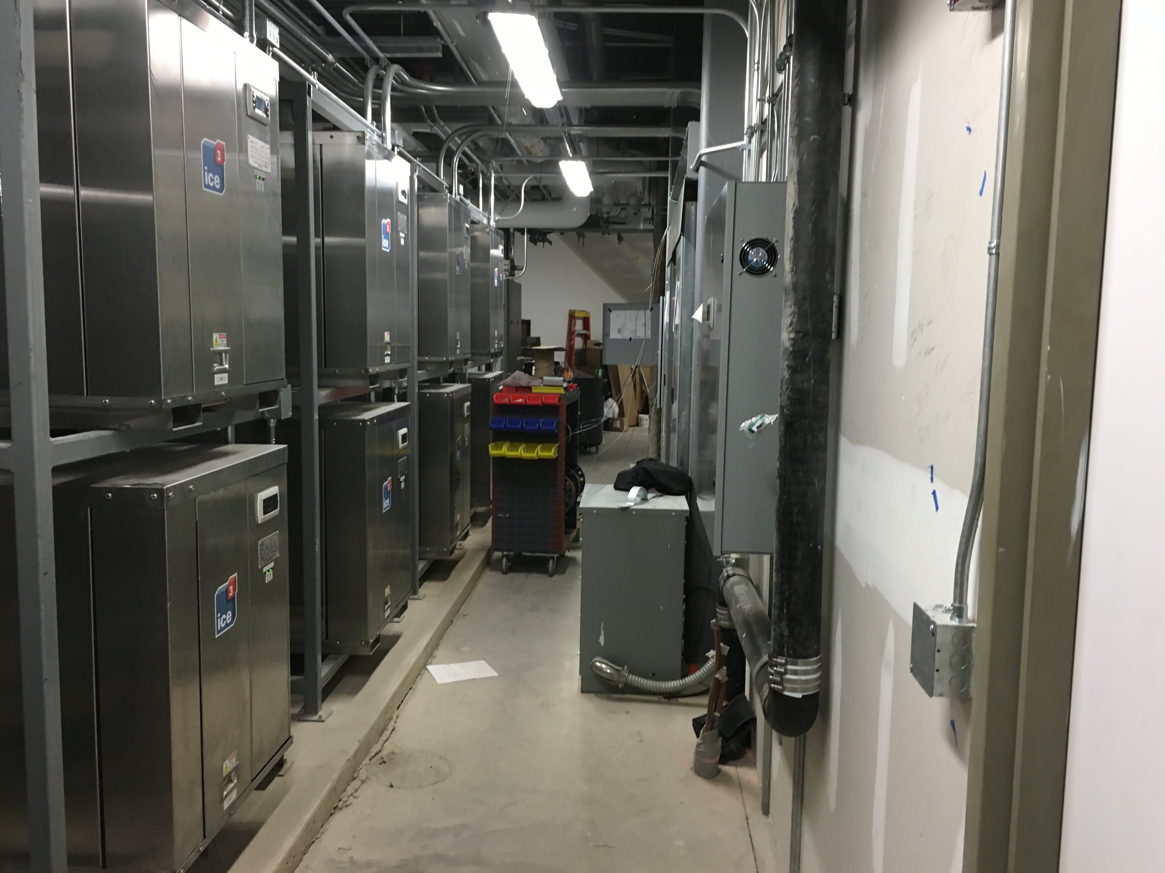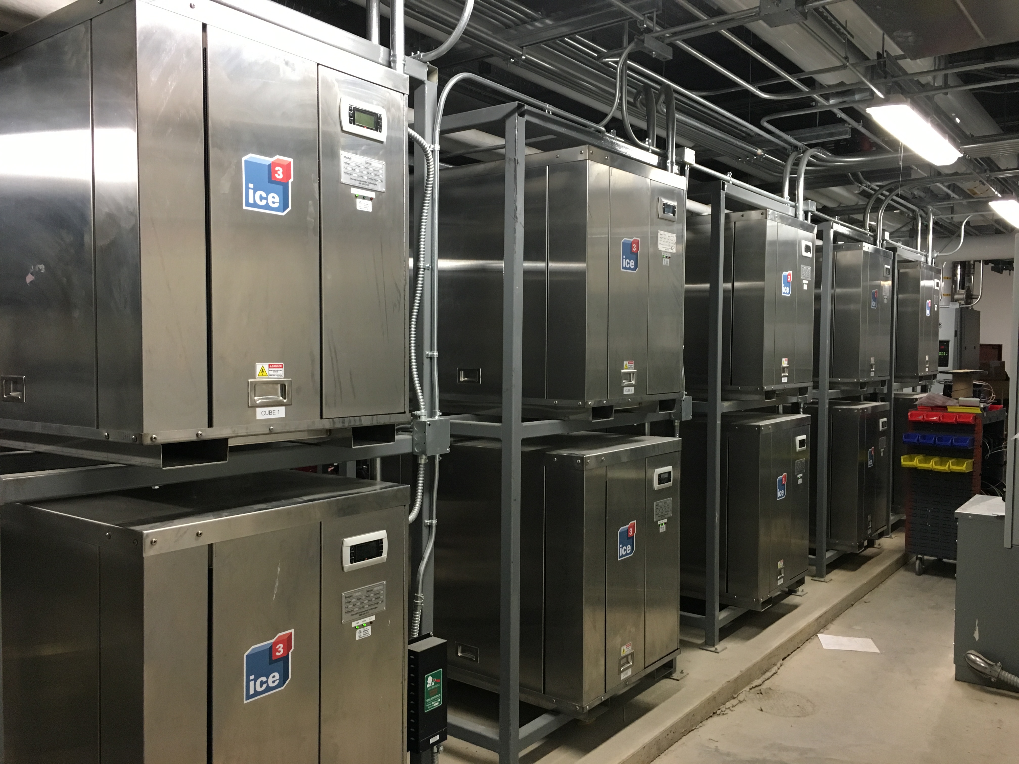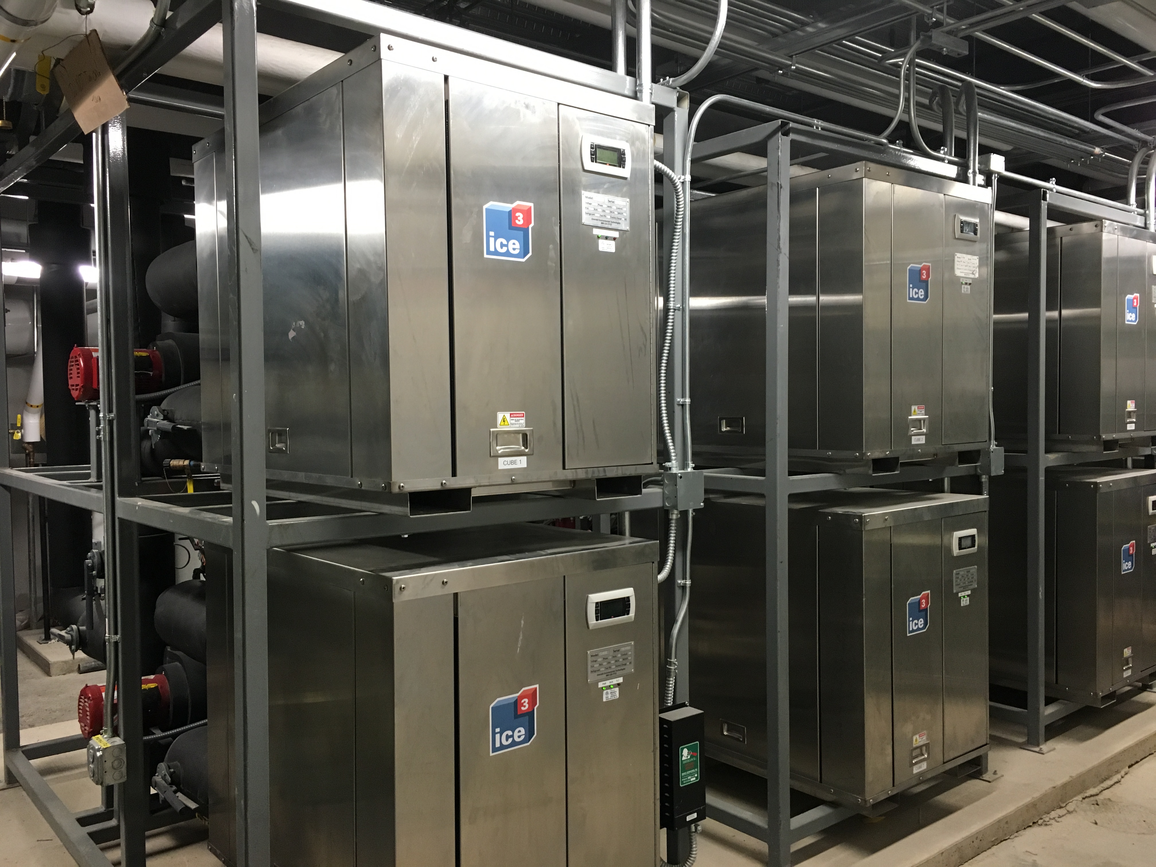 Working with RFS Engineering, Stevens Engineers, and Sasaki‘s General Contractor LeChase Construction a design was formulated to install ten ice3 Cube units totaling 210 TR, with potential expansion to twelve ice3 Cubes. Six of the ten Cube units have the ability to act as a source of air conditioning for the facility, maintaining ice during summer periods of low usage. As the November hockey season approached, the AC load diminished and the Cubes were installed in abundance to serve the refrigeration load.