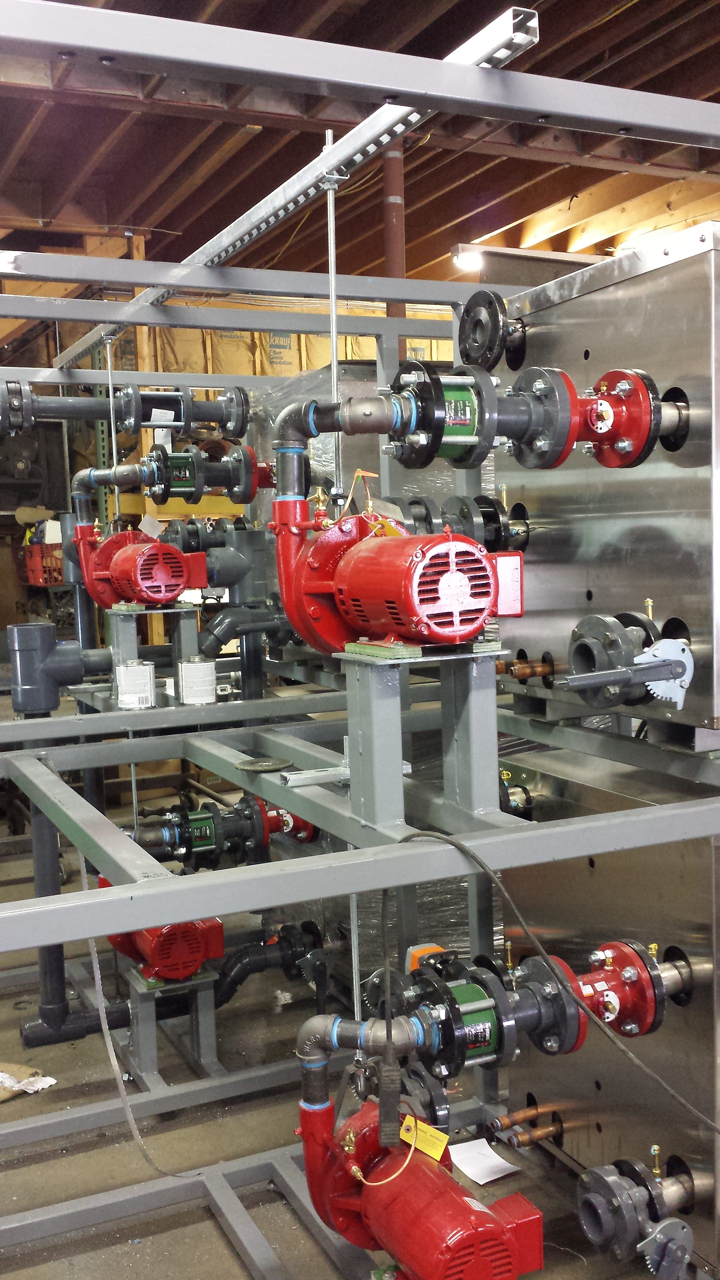 A new ice3 Cube decoupler is now employed, where smaller cold floor pumps at 15 HP were previously used to recirculate the cold floor and operate slowly when occupancy changes, these smaller pumps are still able to achieve a three-minute fluid change in the cold floor for high loads, but they do not have the pressure drop of the Cube’s heat exchangers. Additionally, each ice3 Cube has a small, 2 HP cold pump that circulates to and from the Cube decoupler, but is only in operation when the Cubes are staged on. This pumping horsepower is eliminated when a Cube is not running.
