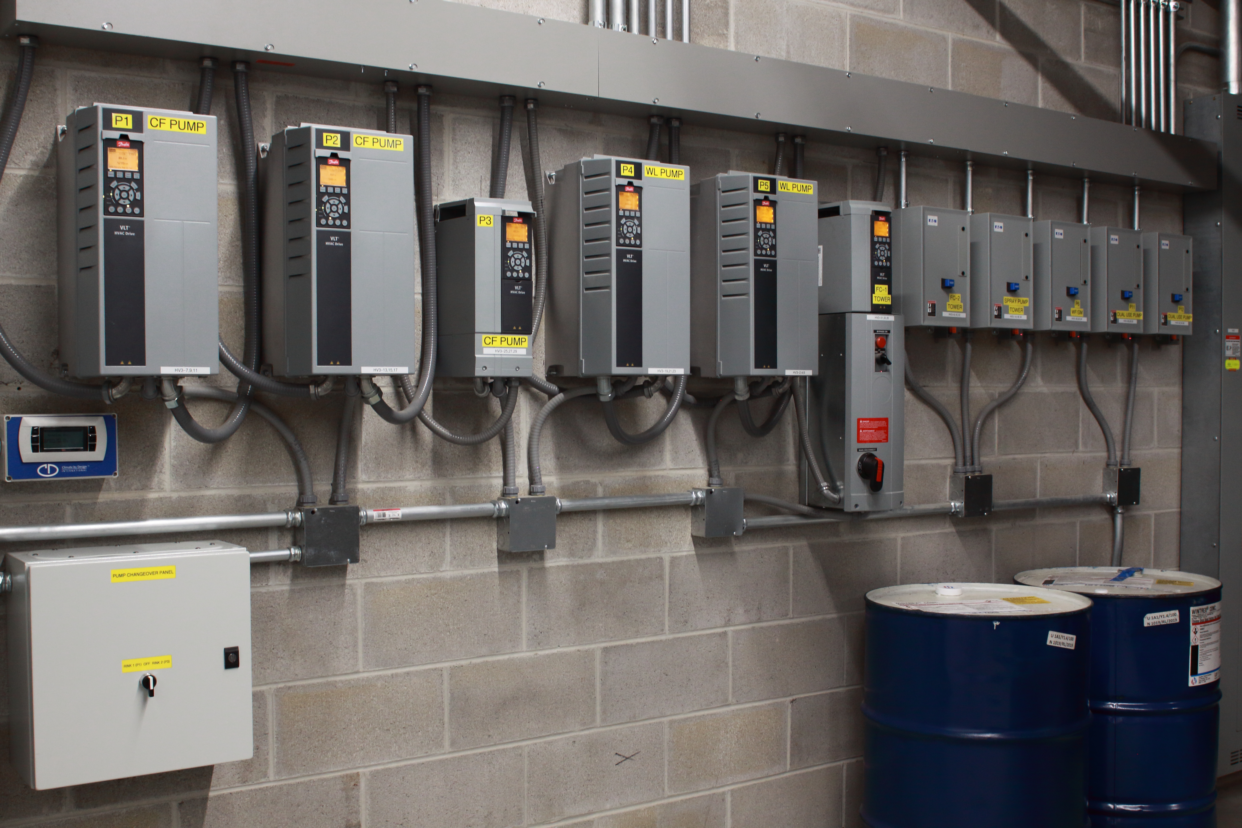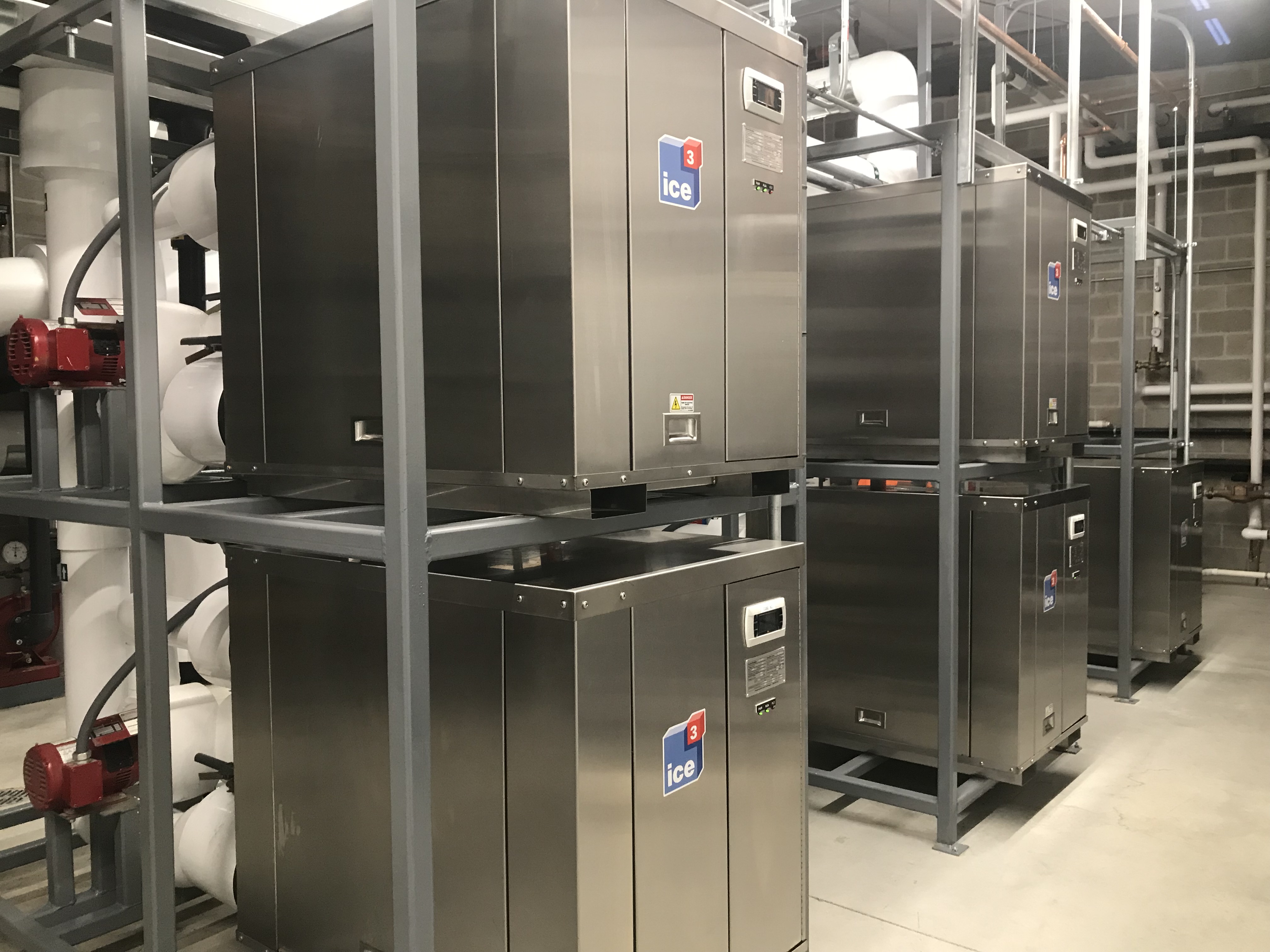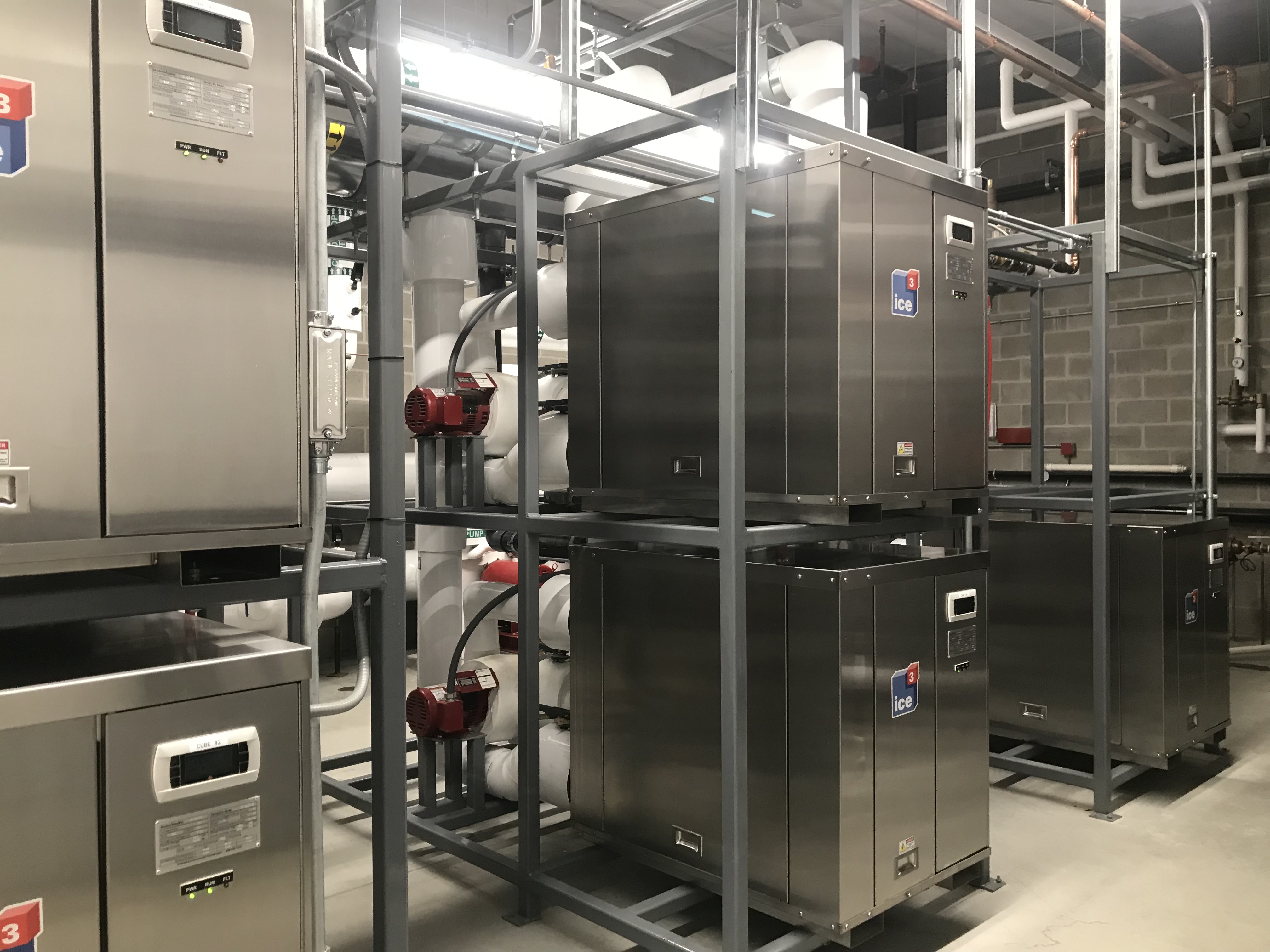 To remain cost competitive, while providing 125 Tons of Refrigeration, a five ice3 Cube pre-piped system was chosen using the new 2545 model ice3 Cube. The new 2545 model was chosen because of its higher capacity while in the same size Cube cabinet as the 2040 model. This allowed for a shared refrigeration room with water heaters, boilers, and fire protection equipment but eliminated the cost of segregated concrete block walls and doors associated with an isolated ammonia refrigeration plant. The 2545 model Cube was the best option for reclaiming heat and producing a small amount of air conditioning, as well as allowing room for future expansion if desired.
