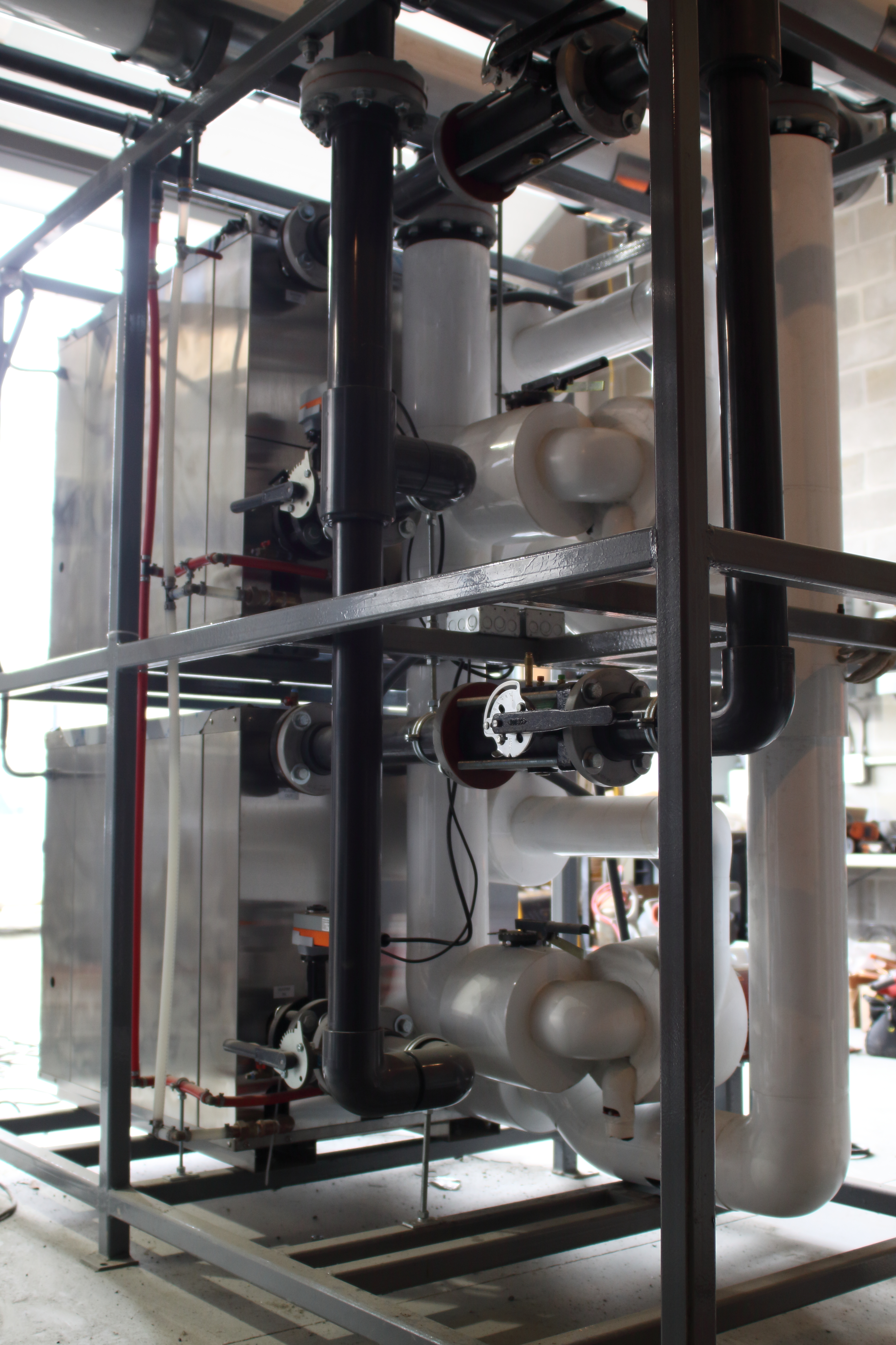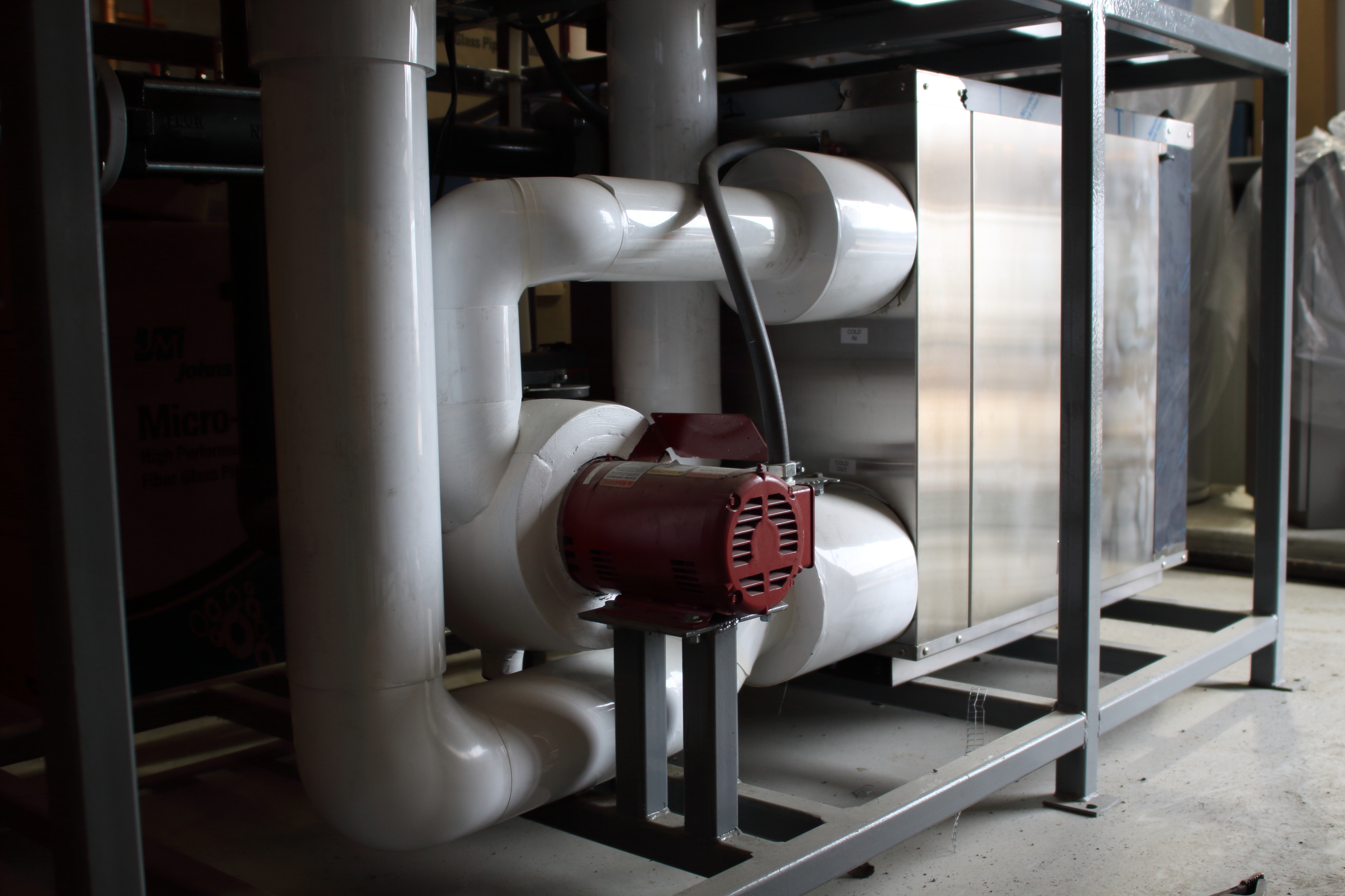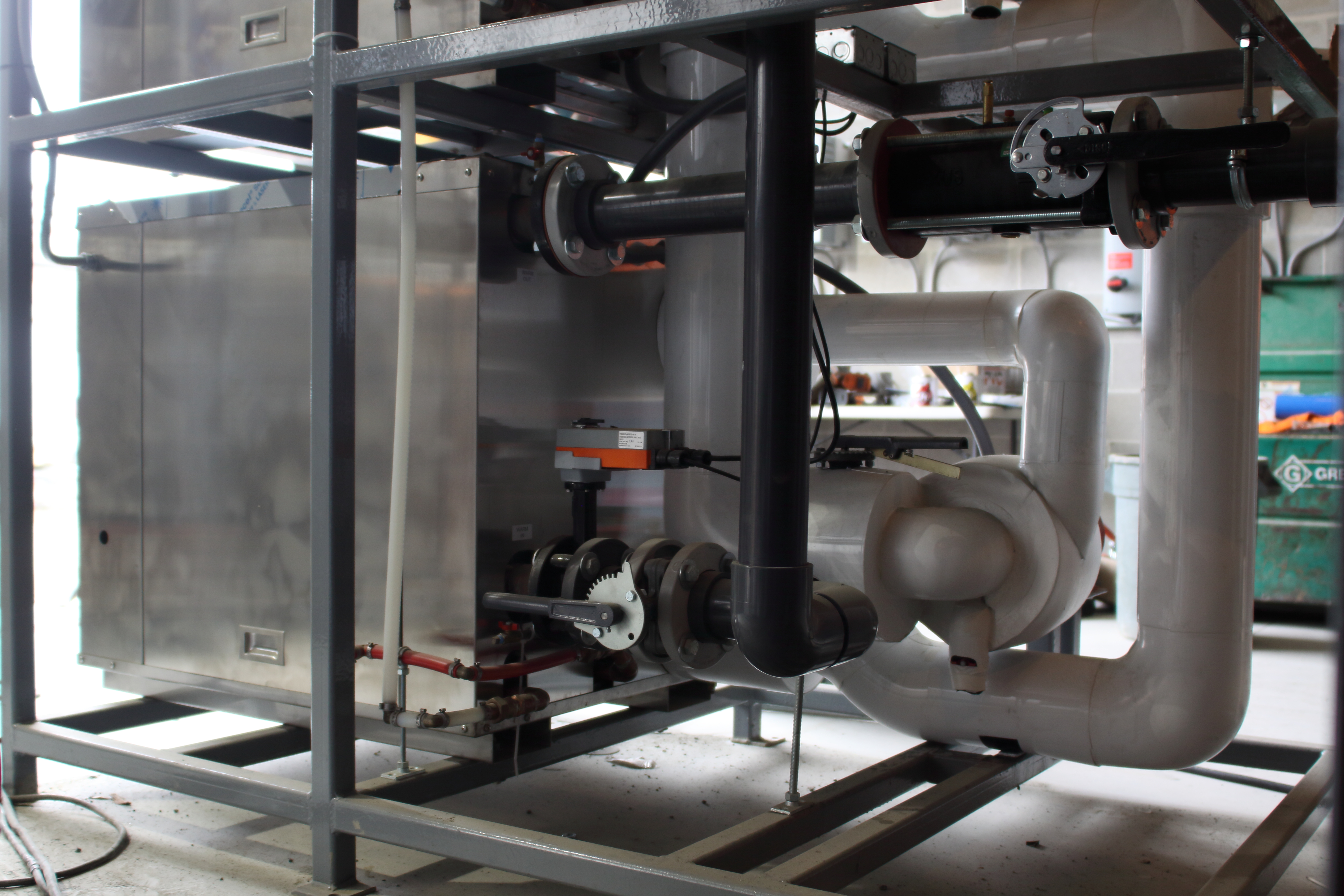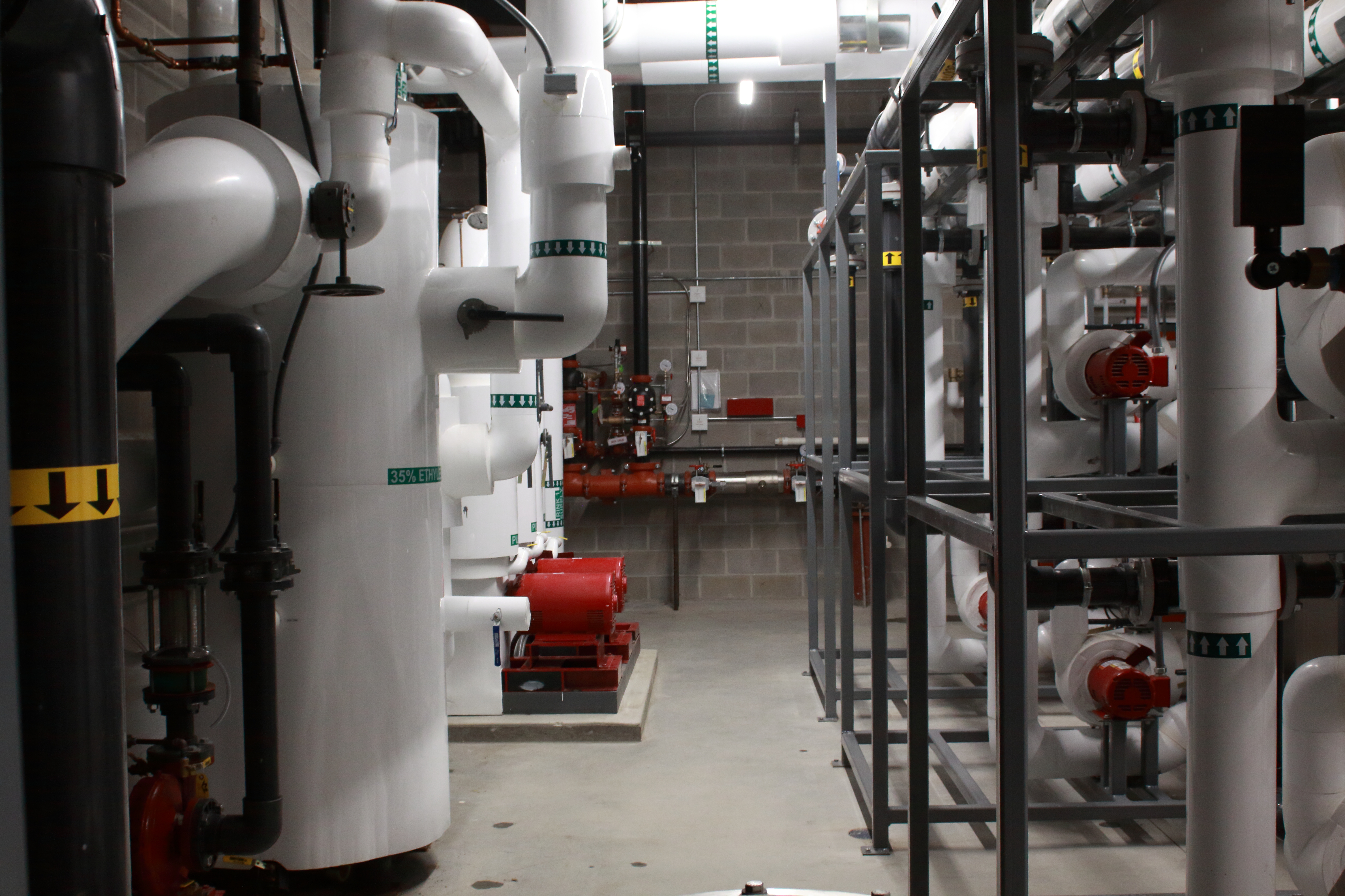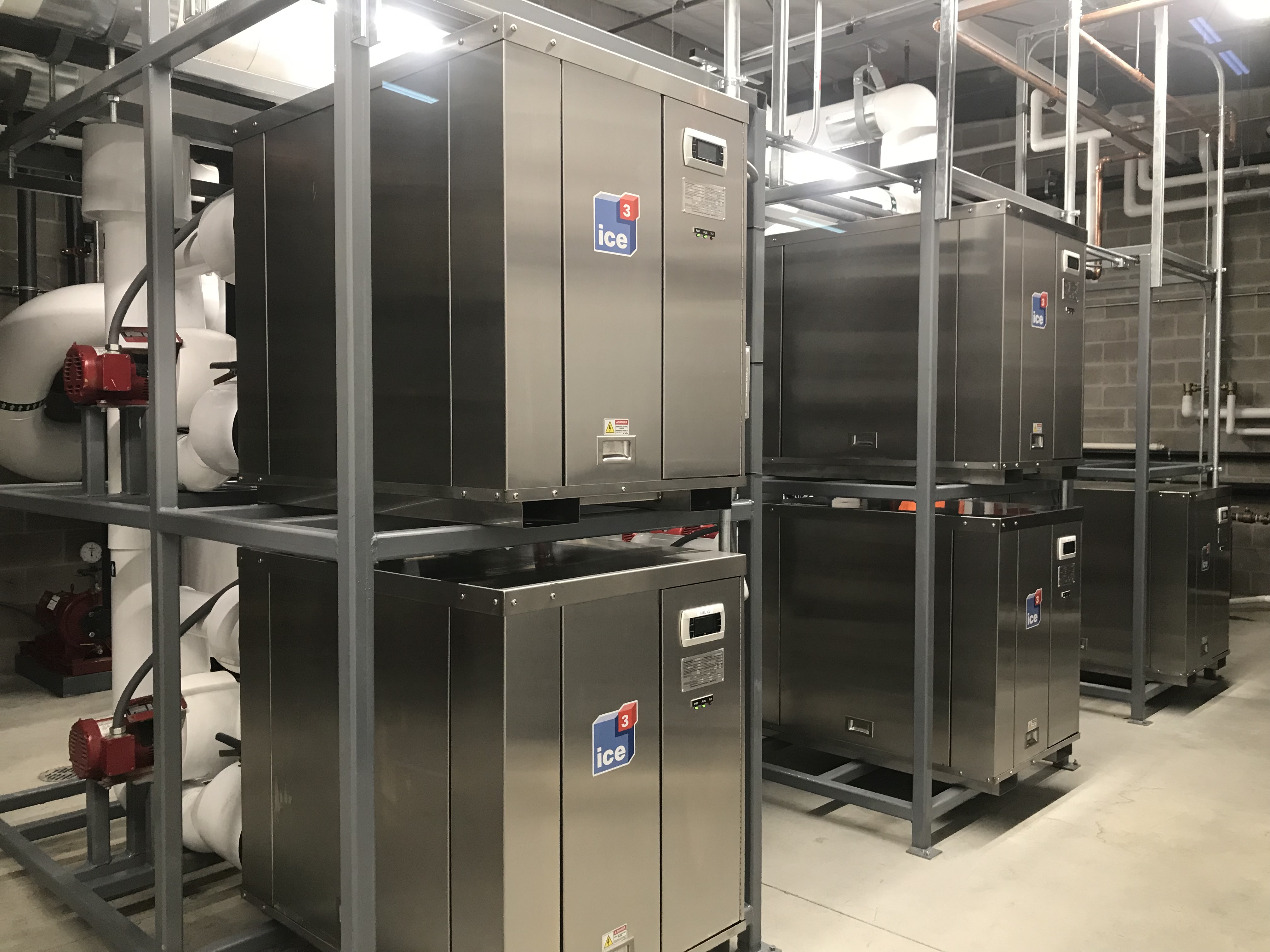 The five ice3 Cube units are incorporated into a system of stands in-house where they are pre-piped and wired with control valves, pumps, piping headers, insulation and accessories. Before leaving the Emerald Environmental Technologies’ factory, each Cube is subjected to authentic below freezing glycol temperatures and operated to their design conditions on our test station. Control over our construction timing and quality without being subjected to onsite issues creates a tidy and timely plug-and-play installation that contractors appreciate.