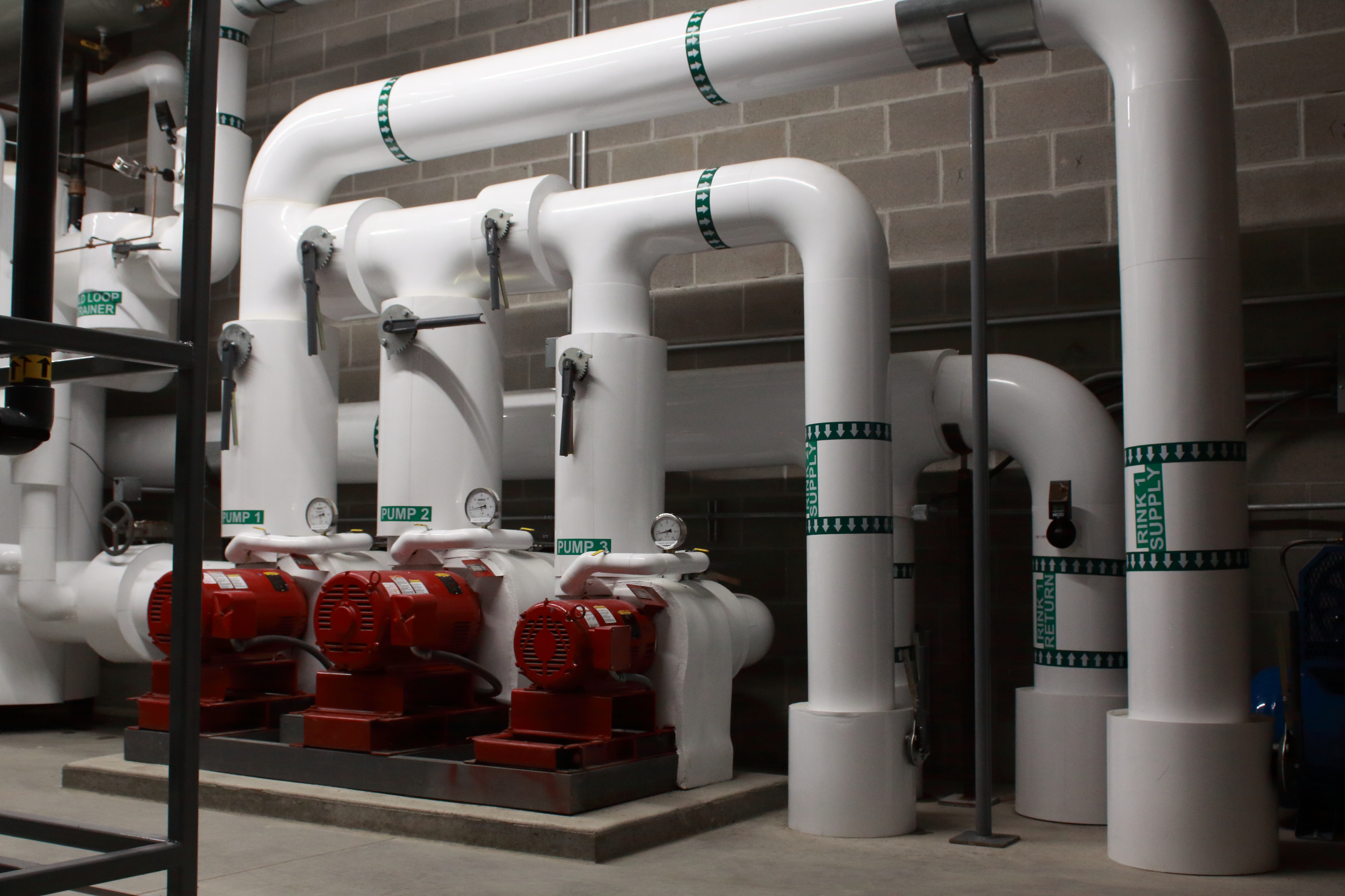 It was decided that the reclaimed heat sourced from the ice3 Cube’s operation would be allocated for many uses including radiant floor heat in the locker rooms and mechanical rooms, heating the snowmelt pit for rapid snow melt, and a fluid cooling tower basin. The 2545 model ice3 Cubes are also capable of supplying the Zamboni with preheat for the domestic water loop to reduce water heating energy.