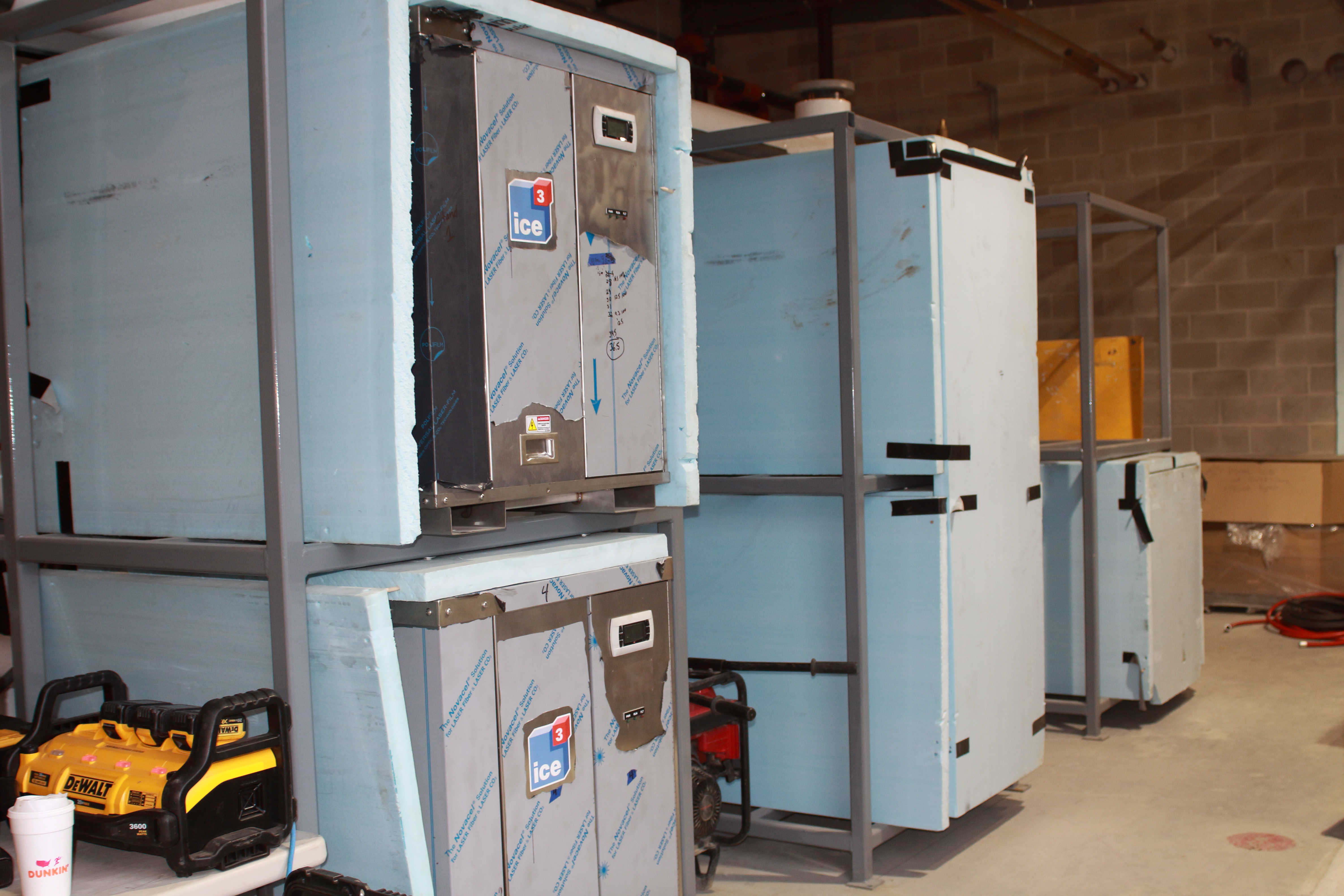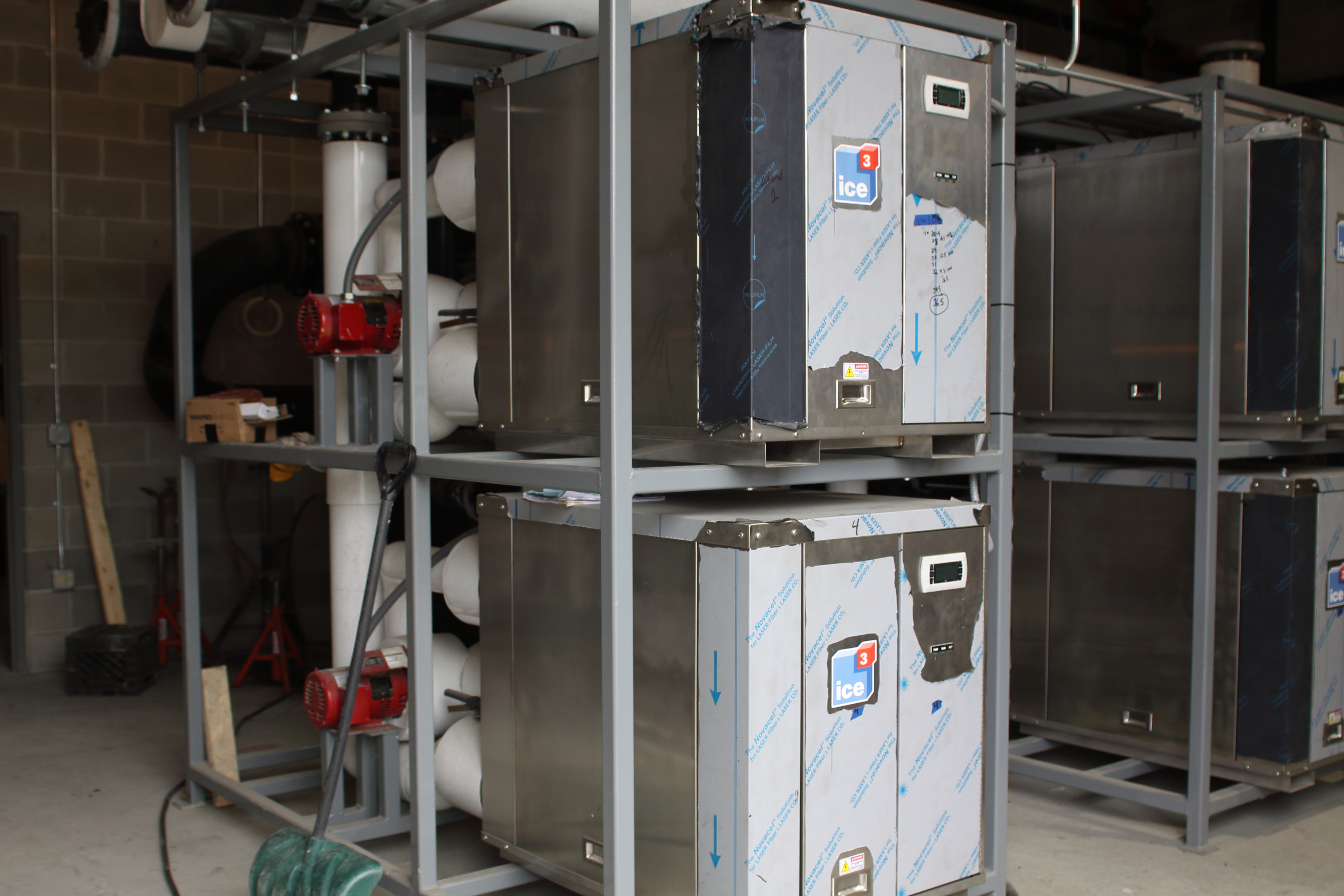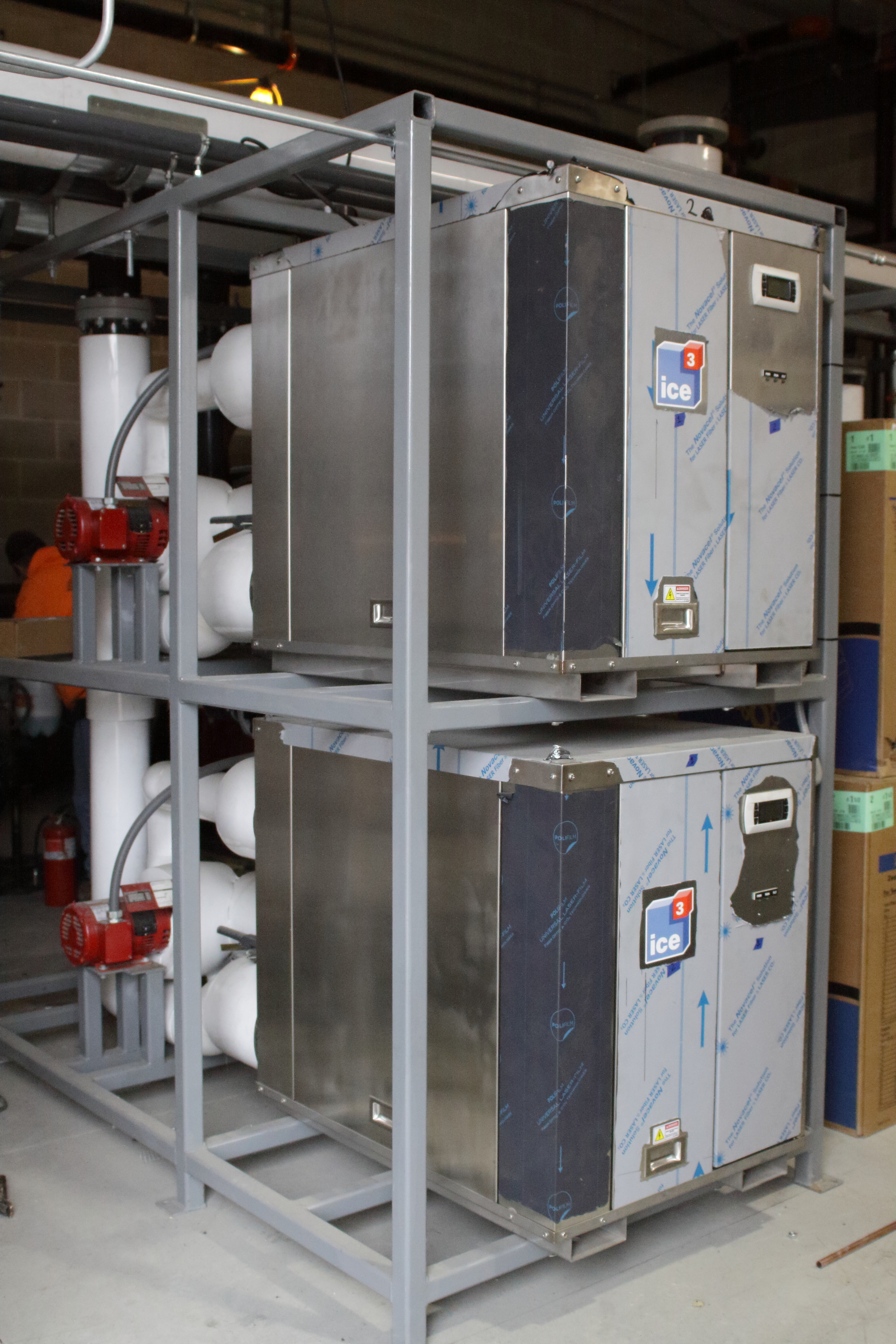 The five Cube racks were delivered and set into the mechanical room while interior construction work was still underway. The ice3 Cubes and stands are entirely wrapped to protect them from jobsite dirt and debris. When the interior work on the jobsite is complete, the ice3 Cube configuration will only need to be tied into the decoupler and warm system, completing the final assembly in less than a day.