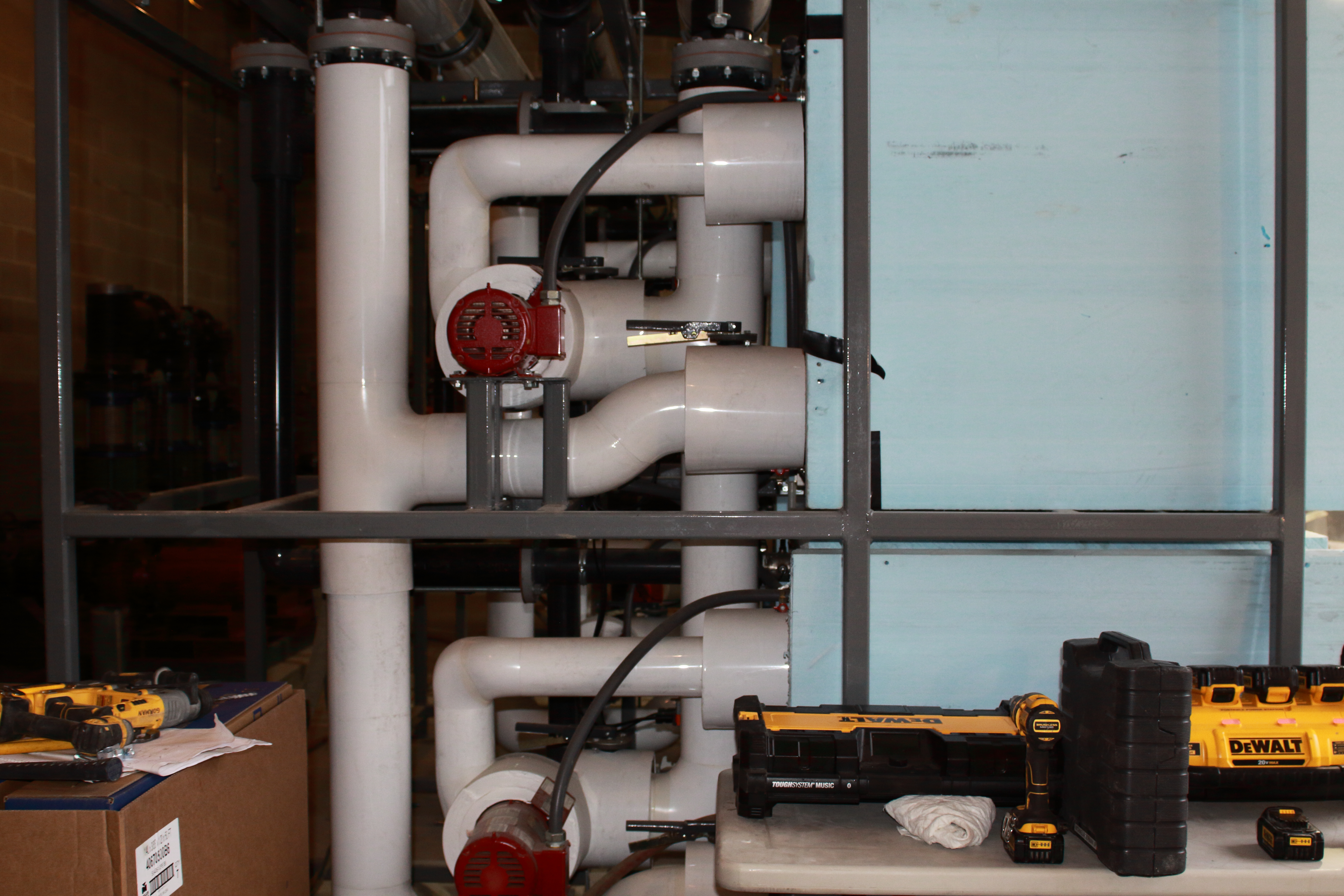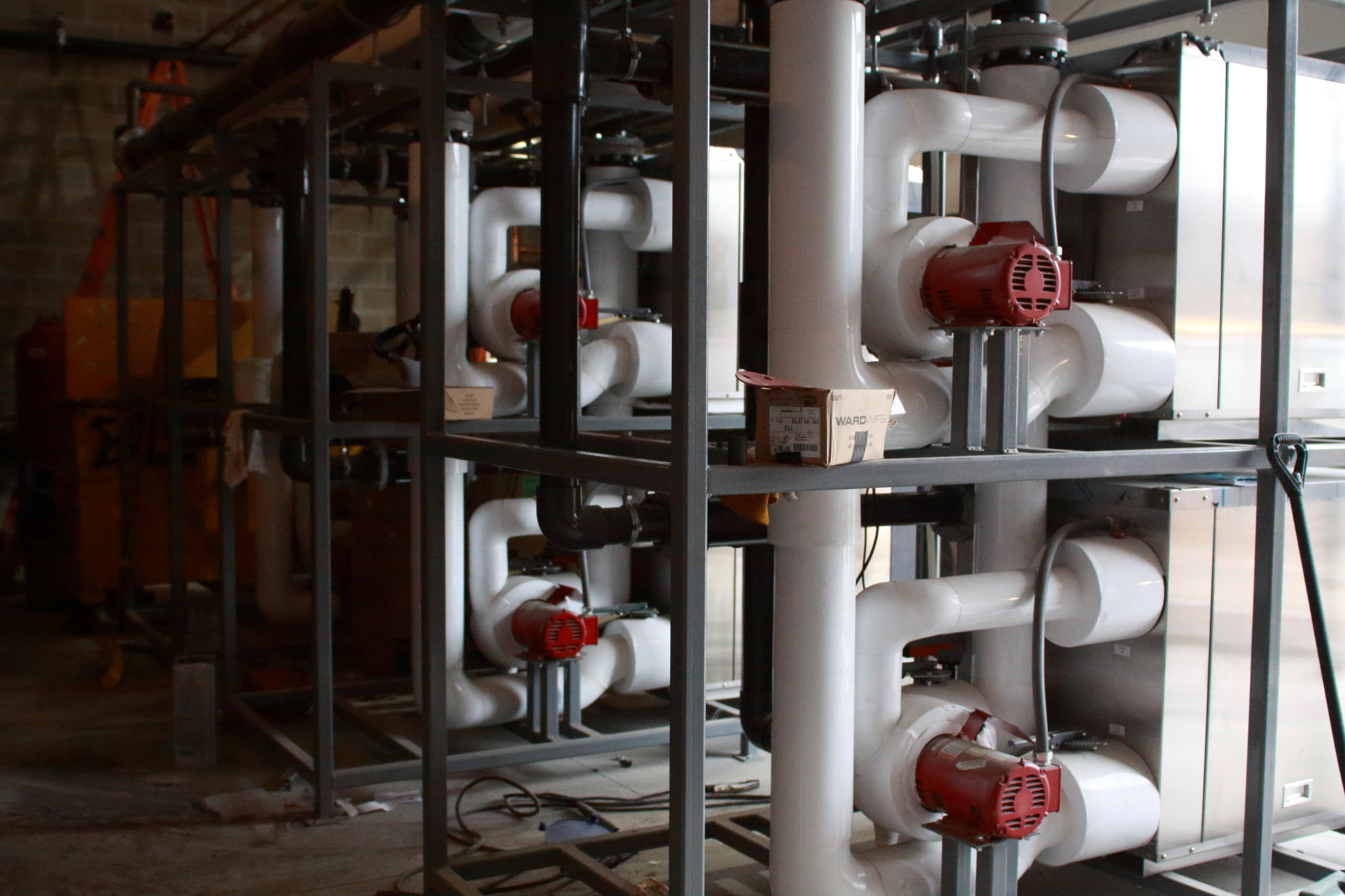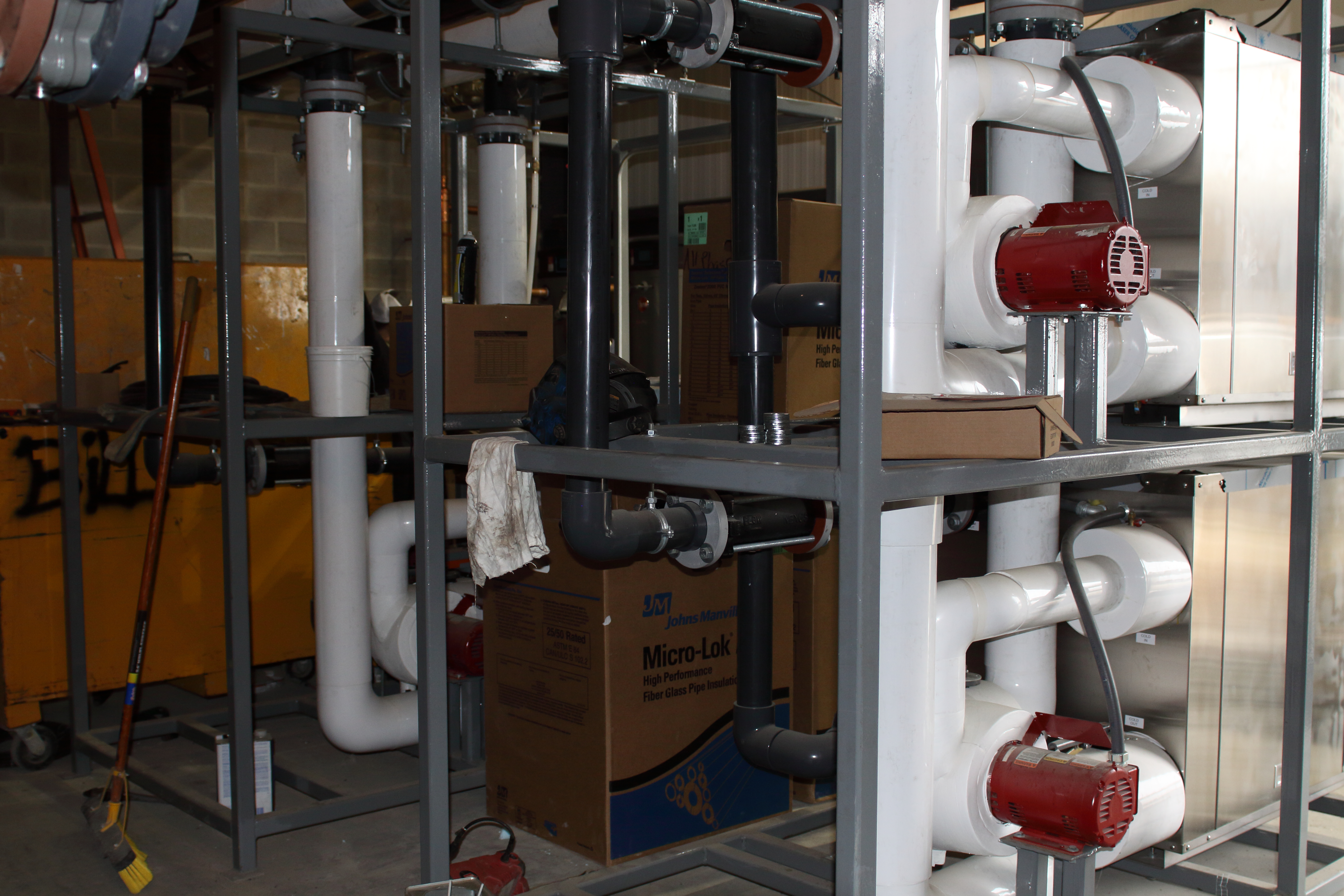 The five Cube racks were delivered and set into the mechanical room while interior construction work was still underway. The ice3 Cubes and stands are entirely wrapped to protect them from jobsite dirt and debris. When the interior work on the jobsite is complete, the ice3 Cube configuration will only need to be tied into the decoupler and warm system, completing the final assembly in less than a day.